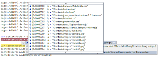 I also made this same class (for the sake of example) responsible for formatting and writing the manifest file to the output stream. That’s why I added a few extra properties to the manifest result, one for each section and one for versioning. Versioning the file comes in handy when you want to expire the cache, because it only expires when the manifest file changes.